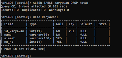 ALTER TABLE namatabel DROP namaatribut. Contoh ingin melakukan penghapusan